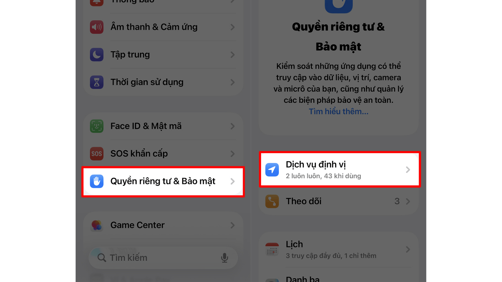 Vào Cài đặt > Quyền riêng tư và bảo mật > Dịch vụ vị trí