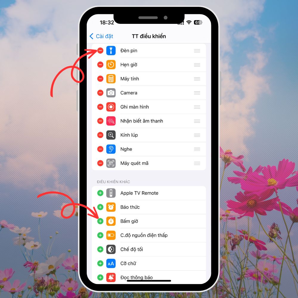 Khi Control Center được mở, bạn có thể truy cập các điều khiển khác bằng cách nhấn và giữ biểu tượng của điều khiển đó để hiển thị danh sách các điều khiển khác. Bạn cũng có thể thêm hoặc xóa các điều khiển trong Trung tâm điều khiển bằng cách đi tới Cài đặt, chọn Trung tâm điều khiển và chọn Tùy chỉnh điều khiển. Từ đây, bạn có thể nhấp vào biểu tượng "+" để thêm điều khiển hoặc biểu tượng "-" để xóa điều khiển. Bạn cũng có thể sắp xếp lại thứ tự của các điều khiển bằng cách nhấn và di chuyển các biểu tượng.