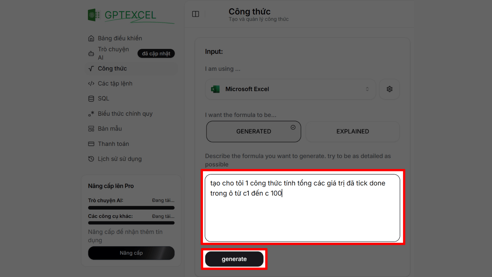Sau khi nhập mô tả, nhấn nút "Generate" để GPTExcel xử lý và tạo ra công thức tương ứng. Kết quả sẽ hiển thị ngay bên dưới, bạn có thể sao chép và dán vào bảng tính Excel của mình.