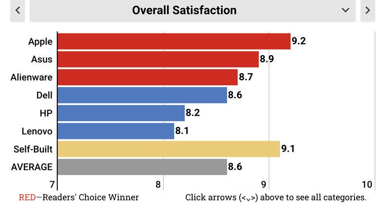 Dựa trên một cuộc khảo sát gần đây trên trang tin PCMag, các khán giả của trang này đã bình chọn mức độ hài lòng chung của họ đối với các nhà sản xuất máy tính cá nhân (PC) trên thang điểm từ 0 (không hài lòng) đến 10 (rất hài lòng), và mới đây Apple đã giành chiến thắng. Nó đã nhận được một số lượng bình chọn ấn tượng, đạt được số điểm hài lòng là 9,2, khiến nó trở thành công ty PC số 1, vượt qua các ông lớn của Window (ASUS, Dell và Dell Alienware, HP, Lenovo)