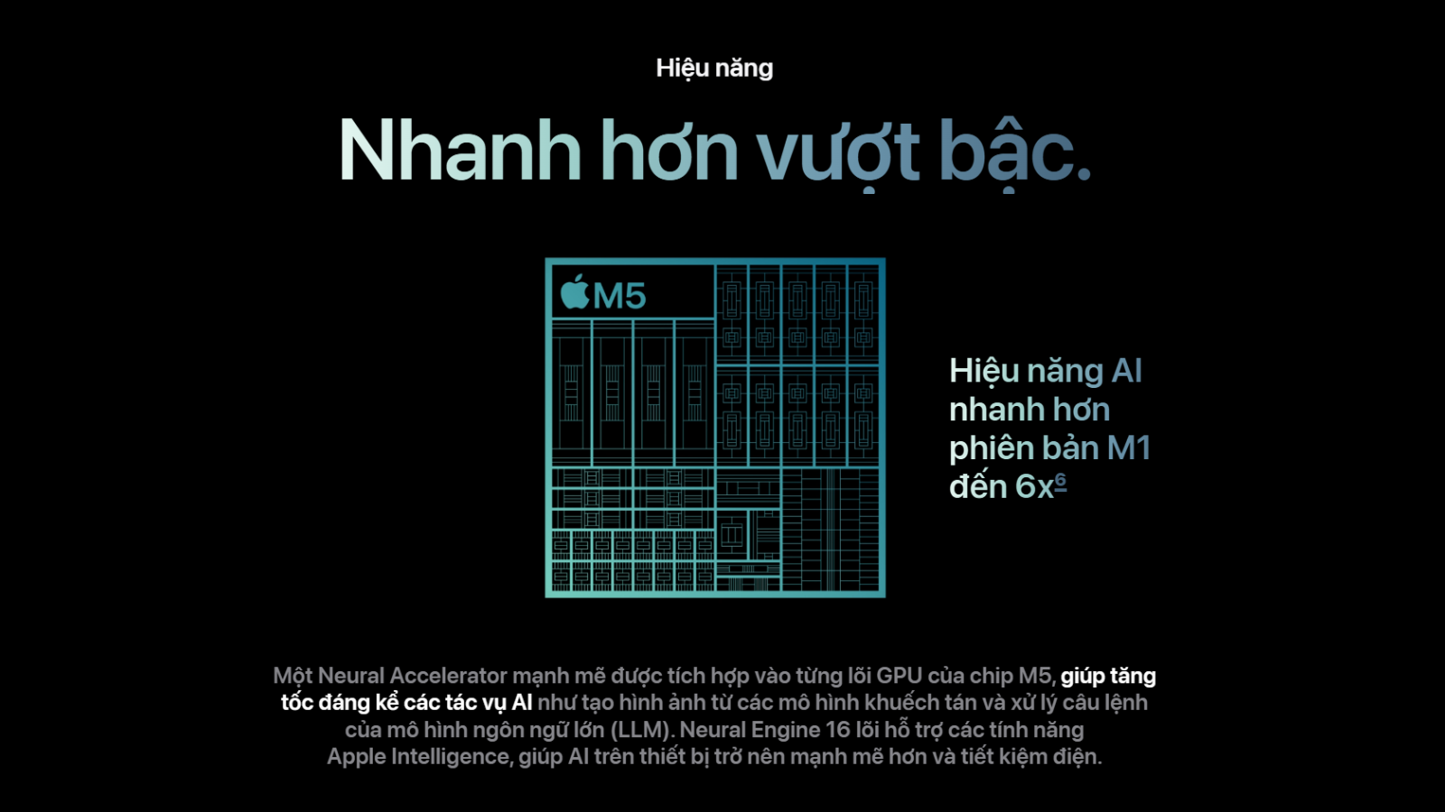 Bộ Neural Engine 16 lõi trên M5 không chỉ nhanh hơn mà còn tiết kiệm điện năng. Sự kết hợp giữa Neural Accelerators trong CPU và GPU giúp M5 tối ưu cho các tác vụ AI cục bộ, từ Apple Intelligence đến Image Playground.