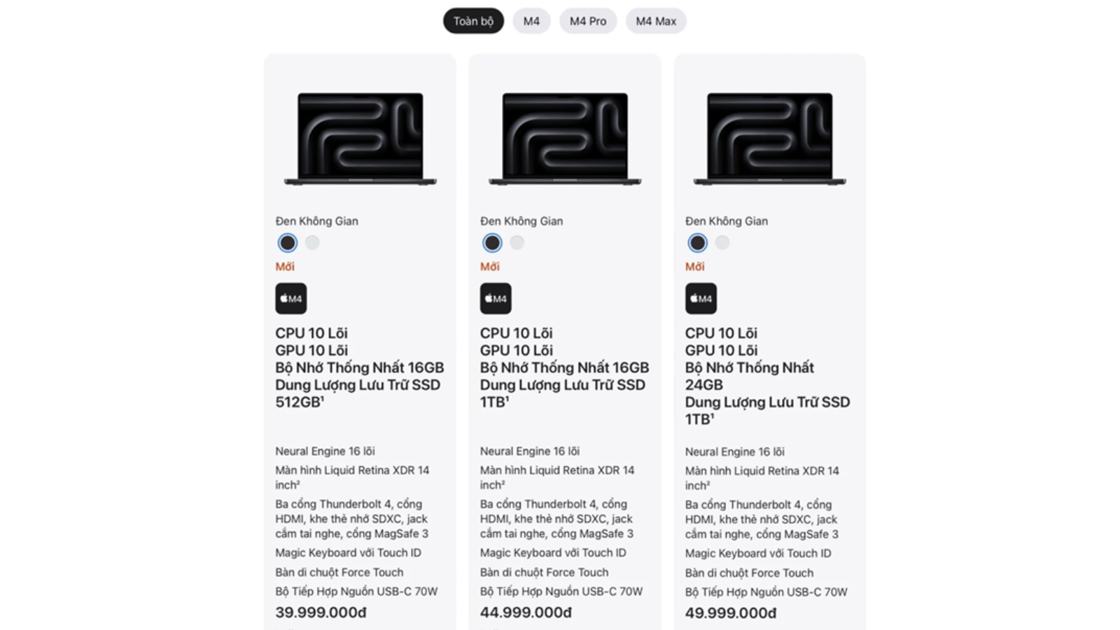 Tại Việt Nam, giá khởi điểm của MacBook Pro M4 bắt đầu từ 39.999.000đ cho cấu hình cơ bản (chip M4, RAM 16GB và SSD 512GB).
