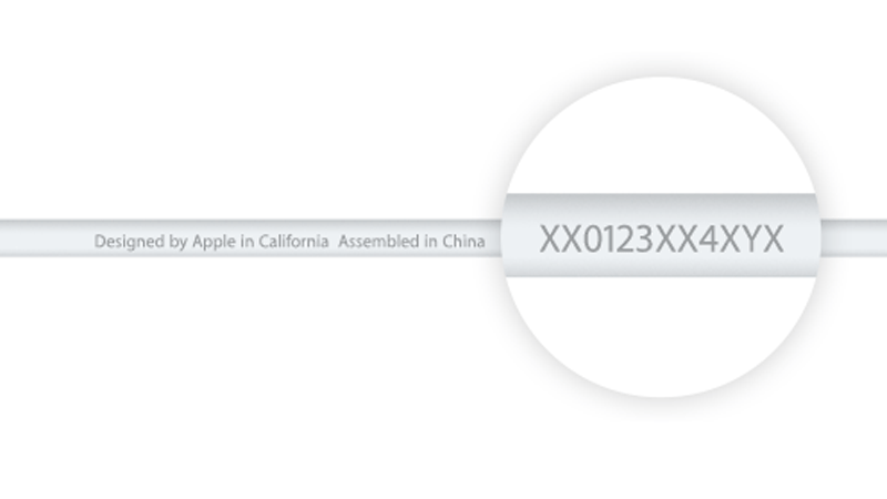 Trước khi quyết định thay toàn bộ bộ sạc, bạn nên kiểm tra xem cáp sạc có thực sự phù hợp với thiết bị hay không. Khi sạc bằng USB-C, cáp sạc sẽ tách biệt với củ sạc. Do đó, chúng dễ dàng được thay thế. Dòng chữ “Designed by Apple in California.” được in trên cáp sạc chính hãng Apple. Assembled in China" (Thiết kế bởi Apple tại California. Lắp ráp tại Trung Quốc). Bên cạnh là một dòng sê-ri chữ và số biểu thị bộ sạc đi kèm.