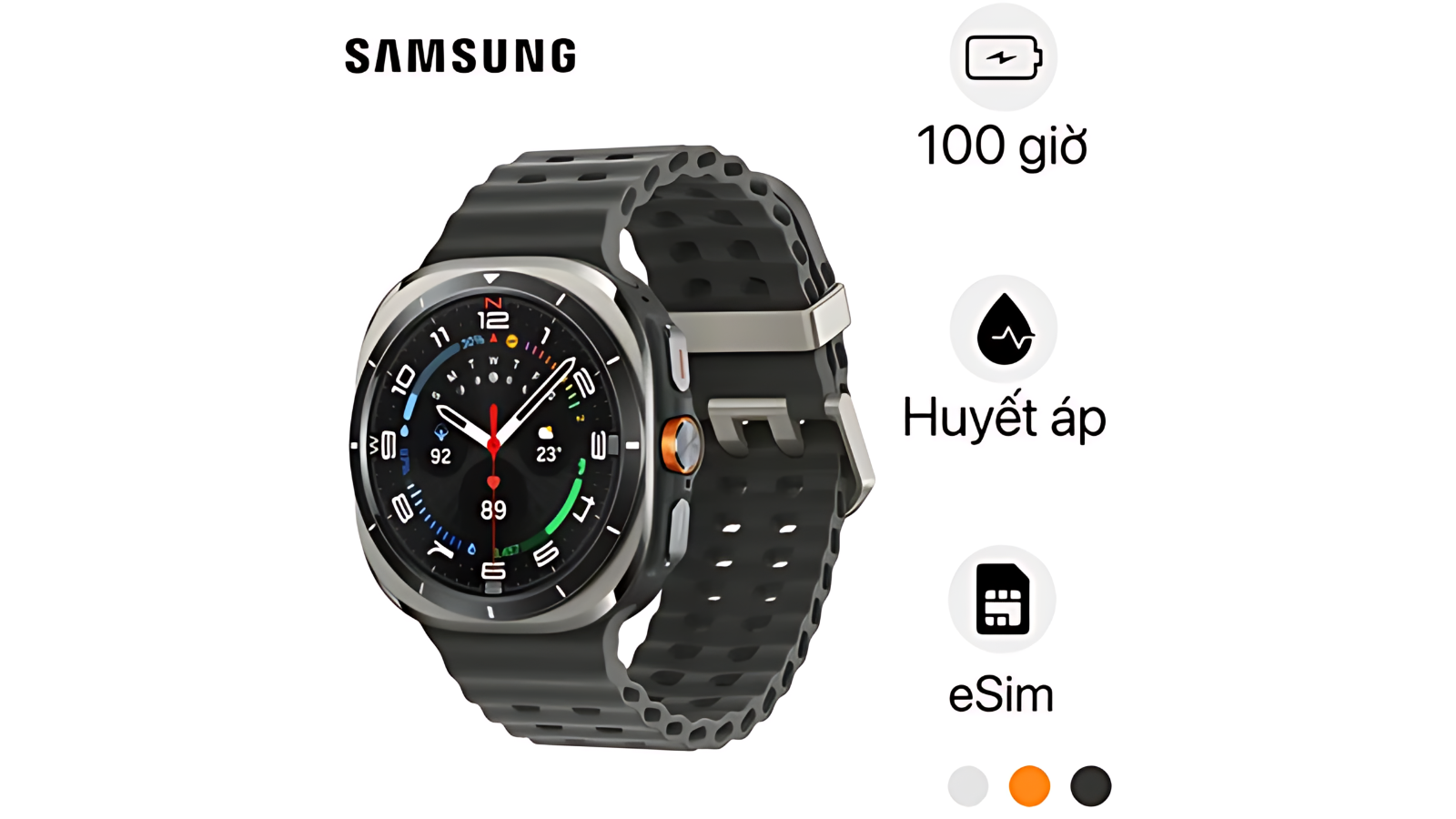 Thiết bị này còn có nút kích hoạt nhanh, còi báo động khẩn cấp và chế độ màn hình ban đêm để dễ dàng đọc trong bóng tối. Màn hình của Galaxy Watch Ultra có độ sáng cao nhất đạt 3.000 nits, đảm bảo hiển thị rõ ràng ngay cả dưới ánh sáng mạnh. Thời lượng pin của thiết bị có thể lên đến 100 giờ trong chế độ Tiết kiệm pin và 48 giờ khi tập thể dục.