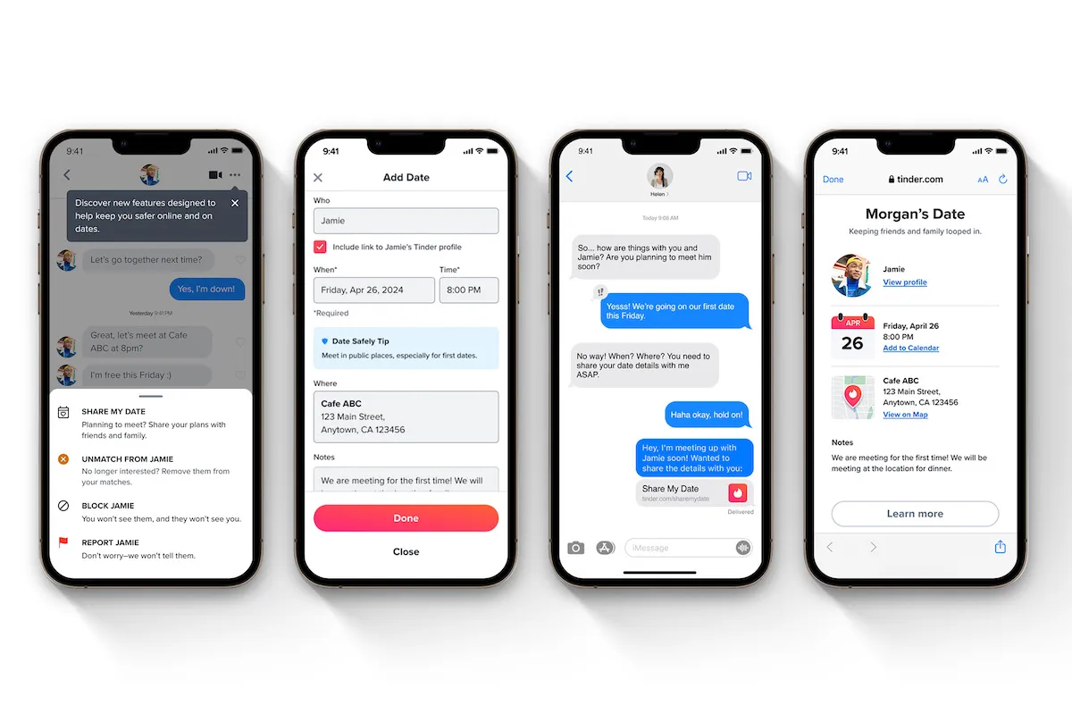 Tinder thông báo vào thứ Hai rằng người dùng bây giờ sẽ có thể gửi một liên kết bao gồm thông tin về cuộc hẹn sắp tới, bao gồm tên của cặp đôi, địa điểm gặp gỡ, ngày và giờ. Cũng có một tùy chọn để gõ ghi chú ở phía dưới. Liên kết có thể được gửi lên đến 30 ngày trước ngày hẹn và có thể chỉnh sửa, để người dùng có thể cập nhật thông tin bất cứ lúc nào.